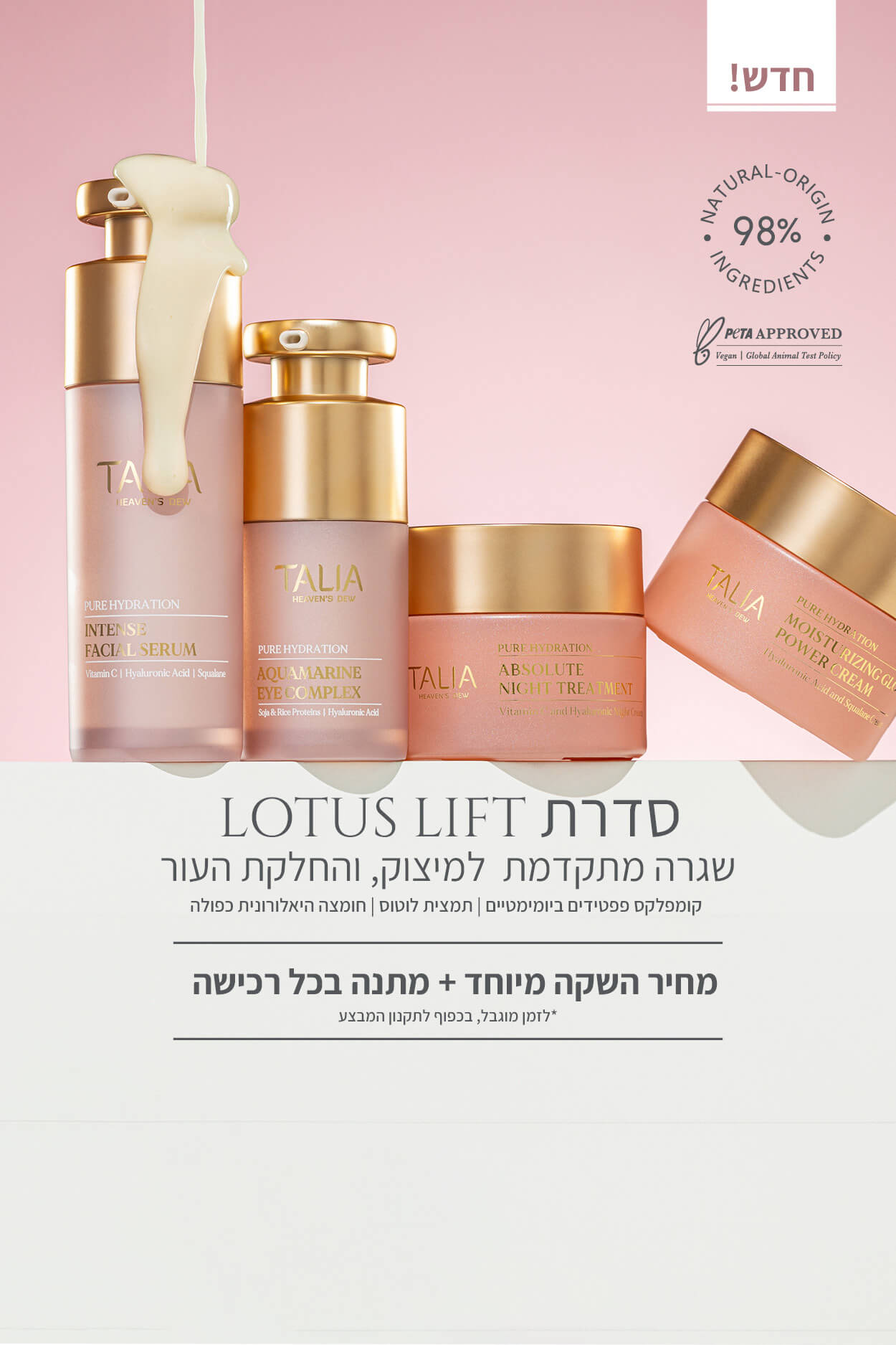 TALIA היא חברת טיפוח פורצת דרך, שהוקמה על ידי ביולוג צמחים מתוך אהבה עמוקה לטבע, למדע ולבריאות העור ומחויבות אמיתית לעור שלך. אנחנו מאמינים שטיפוח בריא מתחיל במרכיבים נקיים ובפורמולות חכמות שמעניקות לעור שלך כל מה שהוא צריך, בלי שום דבר מיותר.